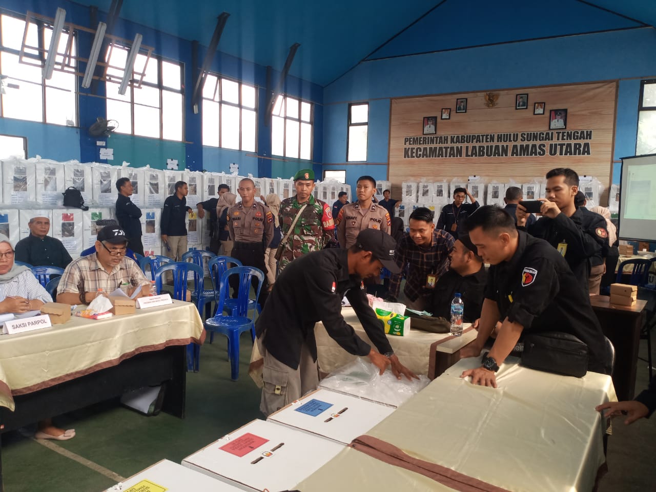 Guna mengantisipasi munculnya masalah terhadap perhitungan suara di PPK, Anggota TNI-Polri dari Kodim 1002/HST dan Polres HST melaksanakan pengamanan rapat pleno rekapitulasi hasil penghitungan perolehan suara Pemilu 2024,