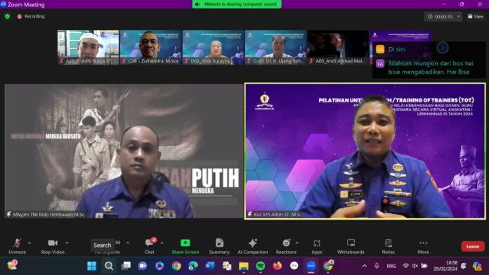Infosatu.cloud, Banjarmasin – Sebanyak 75 orang yang terdiri dari Dosen, Guru dan Widyaiswara sejak Selasa 20 Februari sampai dengan Kamis 29 Februari 2024 mengikuti Pelatihan untuk Pelatih/Training of Trainer (TOT) Pemantapan Nilai-nilai Kebangsaan secara Virtual Angkatan 1 Lemhannas RI Thn. 2024