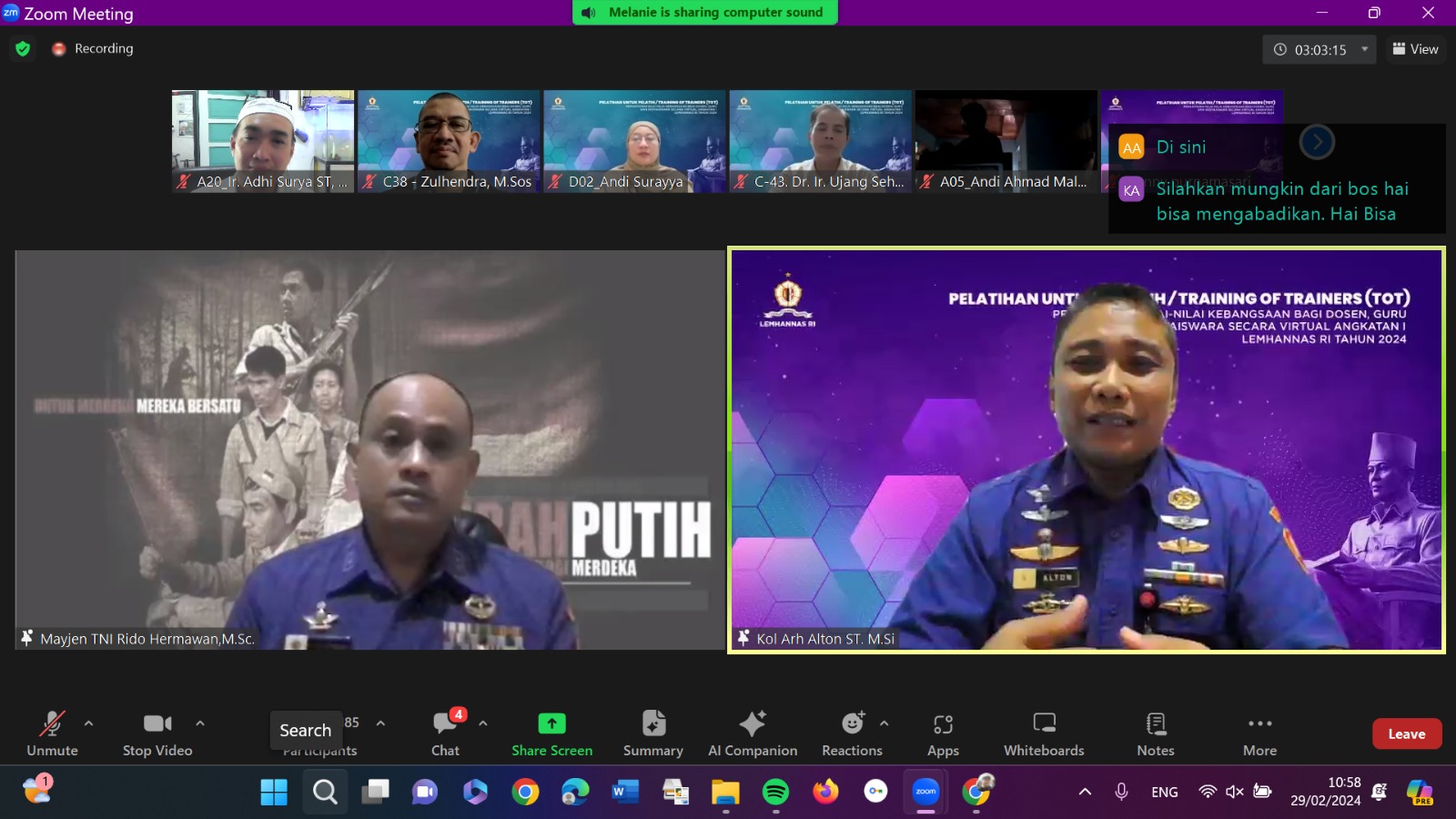 Sebagai peserta Ir. Adhi Surya, ST, MT dan Prof. Dr. Hj. Sulastini, SE, M.Si, CIRR dari Universitas Islam Kalimantan Muhammad Arsyad Al Banjari Banjarmasin menuturkan giat Pelatihan Untuk Pelatih (PUP) Pemantapan Nilai-nilai Kebangsaan secara Virtual Angkatan I Lemhannas RI Tahun 2024 sangatlah baik untuk mengingatkan kembali Nilai – nilai kebangsaan dari 4 Konsensus Dasar Bangsa yaitu : Pancasila, UUD NRI 1945, NKRI dan Bhinneka Tunggal Ika (BTI).
