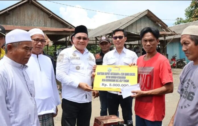 Adapun bantuan dari Bupati Kotabaru kepada 14 Kepala Keluarga dengan pemilik rumah sebanyak 10 Kepala Keluarga sebasar lima juta rupiah (5.000.000,-) dan dari Dinas Sosial sebanyak 15 paket Sembako.