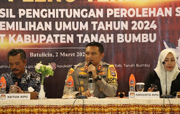 Kapolres Tanah Bumbu AKBP Arif Prasetya Sik mengatakan,” Sangat mengapresiasi personil dan jajarannya yang telah melaksanakan tugas pengamanan dengan baik dan jauh dari potensi konflik. Kami mengimbau untuk tetap berkonsentrasi penuh di sisa tahapan pleno perhitungan suara Pemilu 2024 agar tidak memunculkan gangguan kamtibmas sekecil apapun.