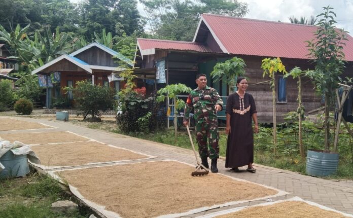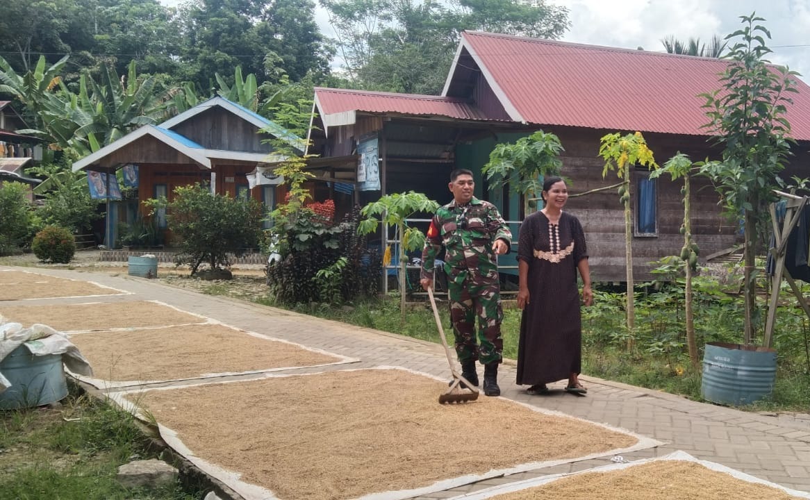 Infosatu. cloud, Barabi – Babinsa Koramil 1002-07/Batu Benawa Serda Tajuddin melaksanakan komunikasi sosial dan bantu warga binaan jemur padi di Desa Baru Kecamatan Batu Benawa Kab.Hulu Sungai Tengah.Minggu (28/04/2024).