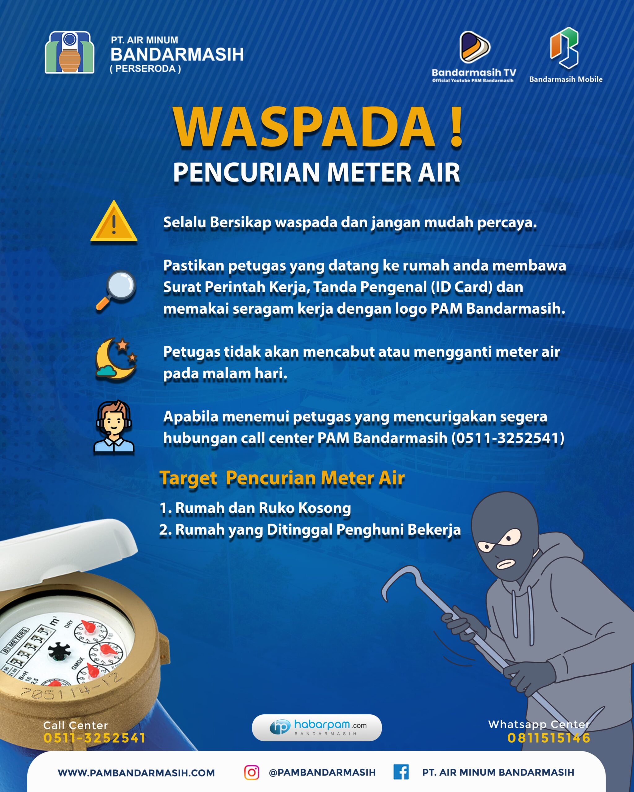 “Jika ada hal yang mencurigakan, segera hubungi call center PAM Bandarmasih dan laporkan ke polisi,” himbau Murjani. (Apr)