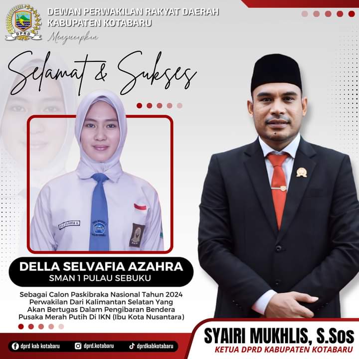 Infosatu.cloud – Ketua DPRD Kotabaru Syairi Mukhlis mengaku, bangga dengan Della Selvafira Azahra menjadi kebanggan bagi warga Kabupaten Kotabaru terpilih menjadi calon Pengibar Bendera Pusaka Nasional (Paskibrakanas) pada 17 Agustus 2024 di Ibu Kota Nusantata IKN, Senin (24/6/24).