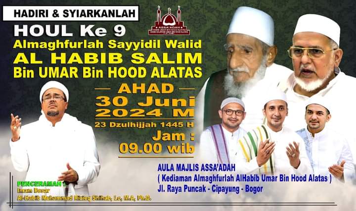 Infosatu.cloud, Bogor – Ponpes Habib Umar bin Hud Al Athas pada hari Minggu (30/6) bertepatan 23 Dzulhijjah 1445 H jam 08.00 menggelar Haul ke 9 Habib Salim bin Hud al Athas di Aula Majelis As’adah Cipayung, Bogor Jawa Barat.