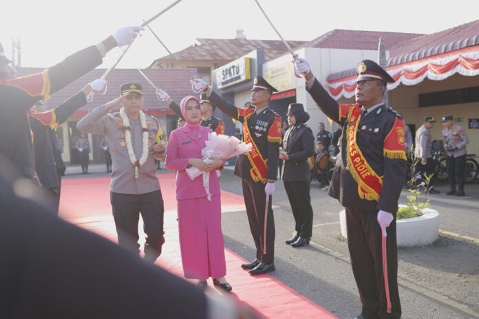 Setelah itu Kapolres Pidie AKBP Jaka Mulyana bersama Ketua Bhayangkari Cabang Pidie Ny. Ruri Jaka disambut dengan tradisi pedang pora didepan gedung utama Polres Pidie.