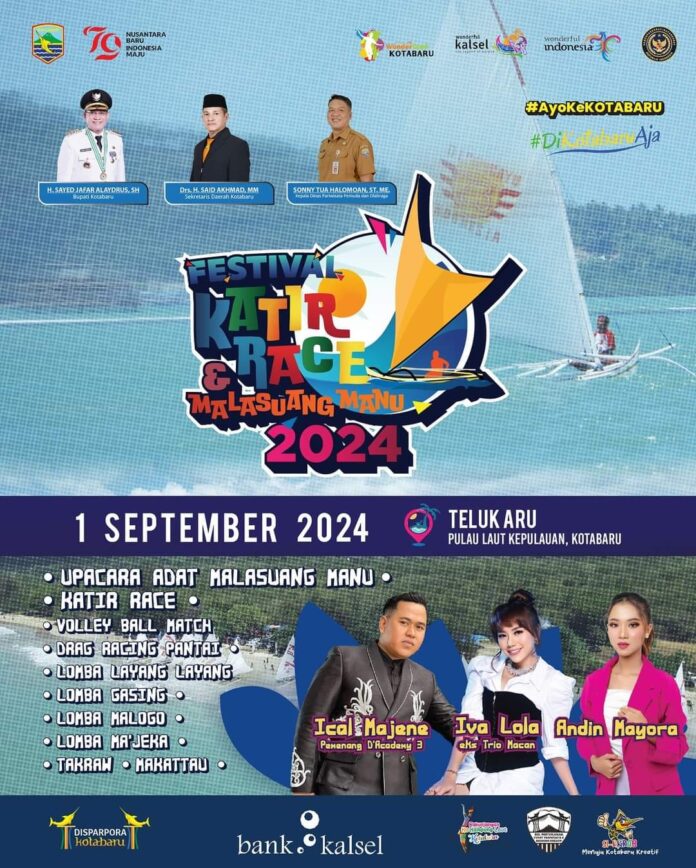 Dinas Pariwisata Pemuda dan Olahraga (Disparpora) Kotabaru akan menggelar Festival Katir Race 2024 di Teluk Aru Pulau Laut Kepulauan, Kabupaten Kotabaru, Kalimantan Selatan.