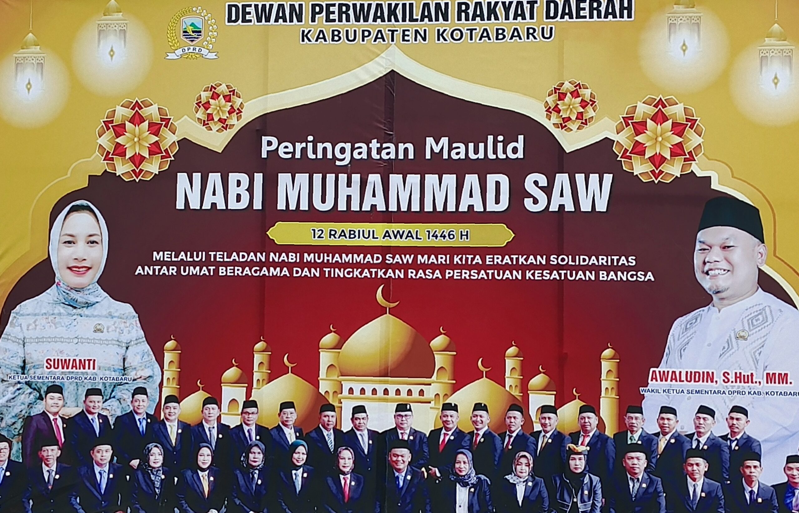 Ketua DPRD Kotabaru Suwanti mengucapkan Selamat Maulid Nabi Muhammad SAW tahun 1446 H / 2024 M. Melalui teladan Nabi Muhammad SAW mari kita eratkan solidaritas anatar umat beragama dan tulingkatkan rasa persatuan kesatuan bangsa.