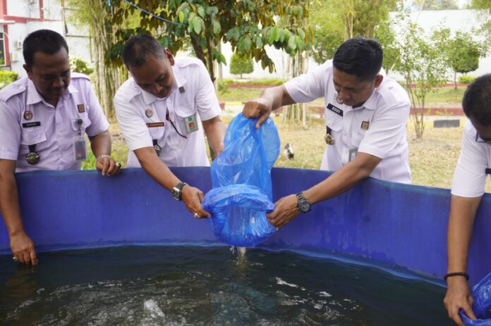 Infosatu.cloud, Karang Intan – Tidak kurang 6.000 ekor bibit ikan nila ditabur pada kolam bioflok Lembaga Pemasyarakatan (Lapas) Narkotika Kelas IIA Karang Intan, Rabu (18/9). Kepala Lapas, Edi Mulyono, didampingi strukturalnya lepaskan langsung bibit ikan tersebut sebagai salah satu program unggulan pembinaan kemandirian yang diselenggakan Lapas Narkotika Karang Intan untuk warga binaannya.