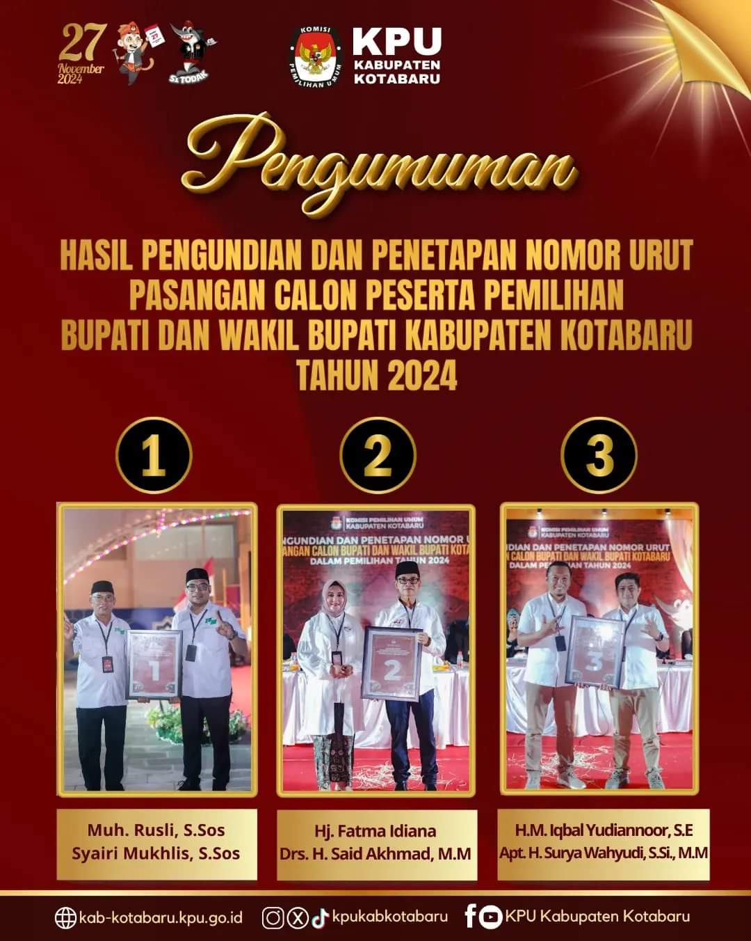 Ketua KPU Kabupaten Kotabaru Andi Muhammad Saidi mengatakan,”KPU Kabupaten Kotabaru sudah melaksanakan pengundian nomor urut pasangan calon bupati dan wakil bupati tahun 2024, nomor urut 1 : Muh. Rusli, S.Sos dan Syairi Mukhlis, S.Sos Nomor urut 2 : Hj. Fatma Idiana dan Drs. H. Said Akhmad, M.M Nomor urut 3 : H. M. Iqbal Yudiannoor, S.E dan Apt. H. Surya Wahyudi, S.Si., M.M.