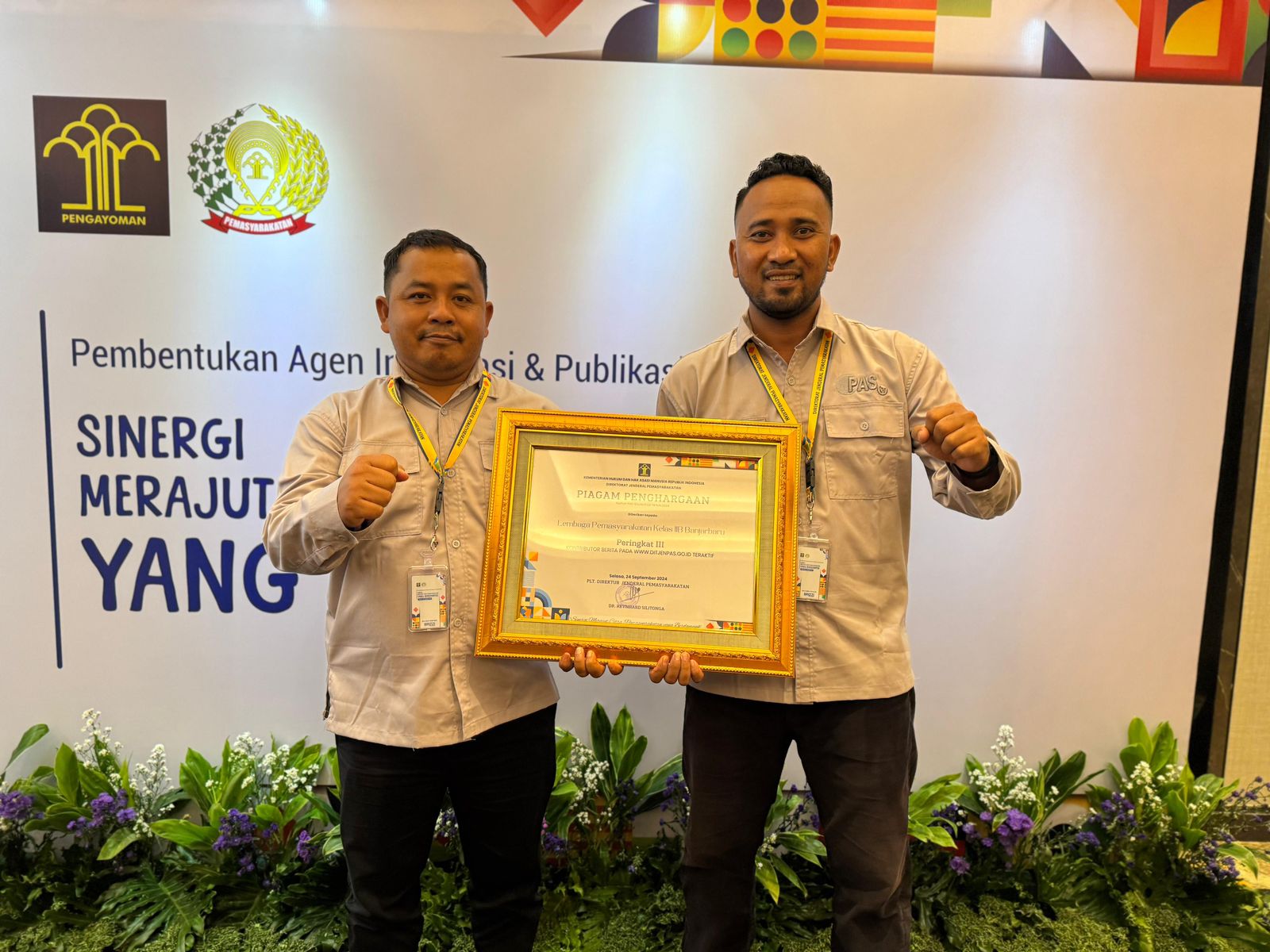 Penghargaan tersebut diserahkan langsung oleh Pelaksana Tugas (Plt.) Dirjenpas, Reynhard Silitonga kepada Kepala Lapas Banjarbaru, I Wayan Nurasta Wibawa, di Hilton Garden Inn Jakarta Taman Palem, Selasa (24/9), pada kegiatan pembukaan Pembentukan Agen Informasi dan Publikasi Pemasyarakatan Tahun 2024 yang bertajuk “Sinergi Merajut Citra Pemasyarakatan yang Berdampak” #HumasBergerakBersama.