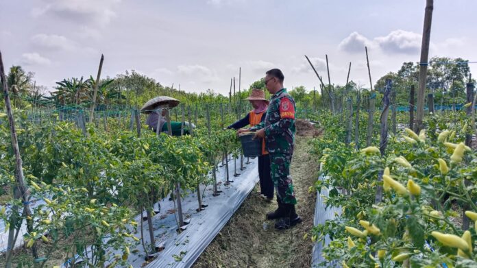 Babinsa Alfiannor membantu petani merawat tanaman lombok tiung dan jagung manis.