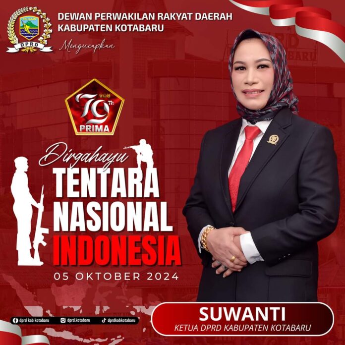 Infosatu.cloud – Ucapan selamat untuk Hari Ulang Tahun Ke-79 TNI tahun 2024 datang dari Ketua DPRD Kabupaten Kotabaru Kalimantan Selatan Suwanti, Sabtu (05/10/24).