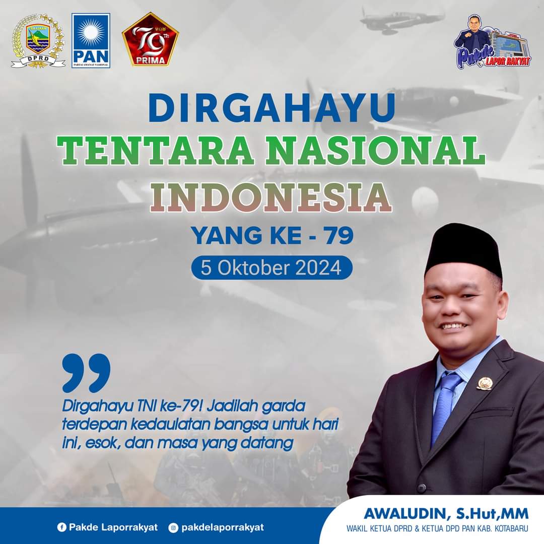 Infosatu.cloud – Wakil Ketua DPRD Kabupaten Kotabaru Awaludin, S.Hut,MM mengucapkan selamat Hari Ulang Tahun Tentara Nasional Indonesia (TNI) yang ke-79 yang jatuh pada 5 Oktober 2024 lalu, Senin (7/10/24)