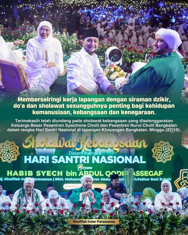 “Terimakasih telah diundang pada sholawat kebangsaan yang dipimpin Habib Syech bin Abdul Qadir Assegaf pada kegiatan yang diselenggarakan Keluarga Besar Pesantren Syaichona Cholil dan Pesantren Nurul Cholil Bangkalan dalam rangka Hari Santri Nasional di lapangan Khayangan Bangkalan. Minggu (27/10).,” kata Hj Khofifah Indar Parawansa, Ketua PP Muslimat NU dalam keterangan resmi hari ini. (Aji)