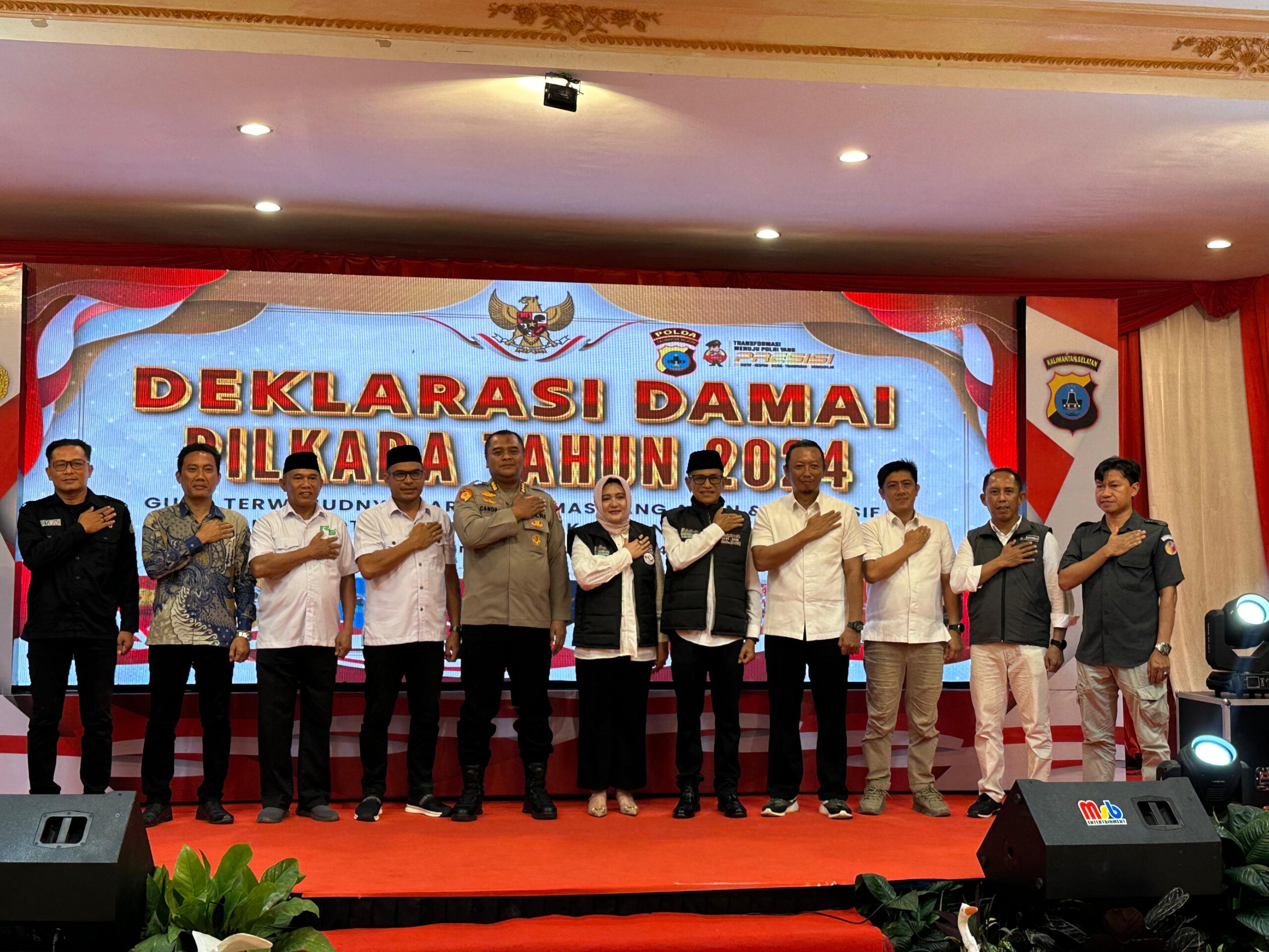 Infosatu.cloud – Polda Kalimantan Selatan menggelar Deklarasi Pilkada Damai Tahun 2024 Dalam rangka Mewujudkan Harkamtibmas Pilkada Kabupaten Kotabaru yang Aman, Damai dan Kondusif, Senin (18/11/24) di Lantai 4 Ballroom Hotel Grand Surya Jl. Suryagandamana No.10 Desa Dirgahayu Kec. Pulau Laut Utara Kab. Kotabaru, Kalimantan Selatan.