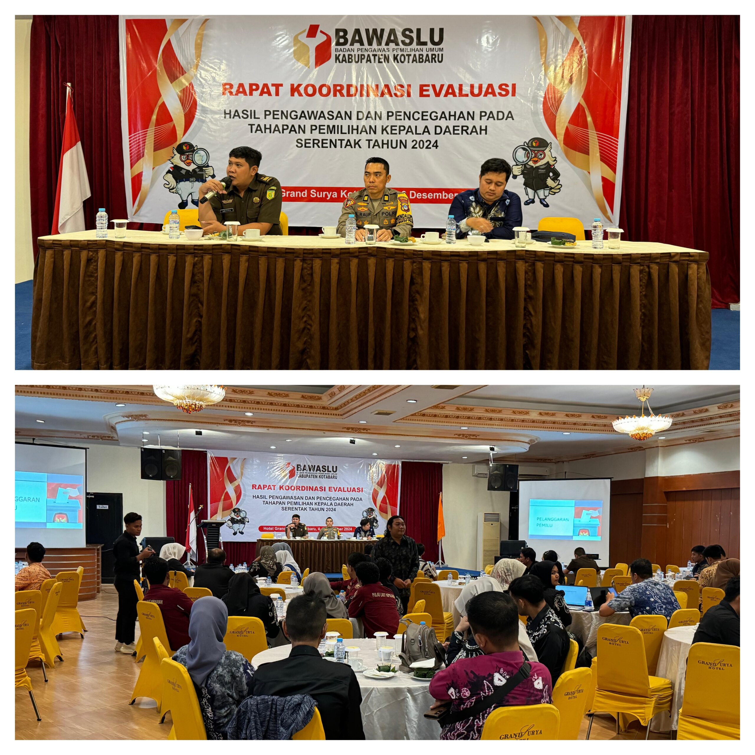 Infosatu.cliud – Polres Kotabaru diwakali Kabag Ops menghadiri Rapat Koordinasi (Rakor) Evaluasi Hasil Pengawasan dan Pencegahan pada Tahapan Pemilihan Kepala Daerah (Pilkada) Serentak 2024 yang digelar oleh Bawaslu Kotabaru, Kamis (5/12/2024). Kegiatan berlangsung di Ballroom Hotel Grand Surya, Kecamatan Pulau Laut Utara, Kabupaten Kotabaru.
