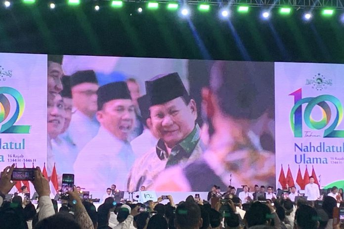 Infosatu.cloud, Jakarta – Puncak Resepsi Harlah 102 Tahun NU yang digelar pada Rabu malam (5/2) dimulai dengan dua lagu pembuka oleh Ummu Salamah (Alma EsBeYe). Suara syahdu dari pelantun sholawat asli Jawa Timur ini diiringi Sabyan Gambus membawa suasana Peringatan Puncak Harlah bertambah hidmat dan syahdu. Selepas lagu Se Abad NU. Presiden Prabowo Subianto disambut meriah saat menghadiri Puncak Peringatan Hari Lahir ke-102 Nahdlatul Ulama (NU) yang mengusung tema “Bekerja Bersama Umat” di Istora Senayan, Jakarta Pusat, Rabu (5/2/2025) malam. Presiden RI Prabowo datang ke dalam area Istora Senayan bersama Wakil Presiden RI Gibran Rakabuming Raka, didampingi oleh Rais Aam NU Miftachul Akhyar dan Ketua Umum PBNU Yahya Cholil Staquf. Prabowo mengenakan kemeja batik lengan panjang dan peci hitam, sedangkan Gibran mengenakan kemeja putih lengan panjang dan peci hitam. Ketibaan Prabowo disambut meriah oleh hadirin yang telah memenuhi Istora. Para hadirin bersorak ketika Prabowo masuk ke lokasi acara, tidak sedikit pula yang merekam momen kedatangan Prabowo. Prabowo membalas sambutan itu dengan melambaikan tangan serta menempelkan kedua tangan di depan dadanya. Ia kemudian menyalami satu per satu kiai NU dan tokoh-tokoh yang duduk di barisan depan, salah satunya Wakil Presiden ke-13 RI, Ma’ruf Amin, yang mengenakan kemeja koko putih dengan sorban putih dan peci hitam. Selain Ma’ruf Amin, hadir pula Menteri Badan Usaha Milik Negara (BUMN) Erick Tohir, Kapolri Listyo Sigit Prabowo, Menteri Dalam Negeri Tito Karnavian, Menteri Sosial Saifullah Yusuf dan Menteri Koordinator Bidang Pangan Indonesia Zulkifli Hasan. Kemudian, ada Menteri Perumahan dan Kawasan Permukiman (PKP) Maruarar Sirait, Anggota DPD RI Alfiansyah Komeng, dan Gubernur Jawa Timur Terpilih, Khofifah Indar Parawansa. Acara bersambung dengan lagu kebangsaan Indonesia Raya dan Yalal Wathon. Lepas pembacaan Kalam illahy oleh Farhan Muhammady bersambung dengan doa pembuka oleh KH Anwar Iskandar (Wakil Rais Am PBNU). Sebagai sambutan pembuka oleh KH Yahya Cholil Staquf (Ketum PBNU). Ketua Umum PBNU Yahya Cholil Staquf (Gus Yahya) mengucapkan selamat ulang tahun ke-17 untuk Partai Gerindra. Hal itu disampaikan langsung Gus Yahya di depan Presiden Prabowo Subianto sekaligus Ketum Gerindra yang hadir dalam acara harlah ke-102 Nahdlatul Ulama.