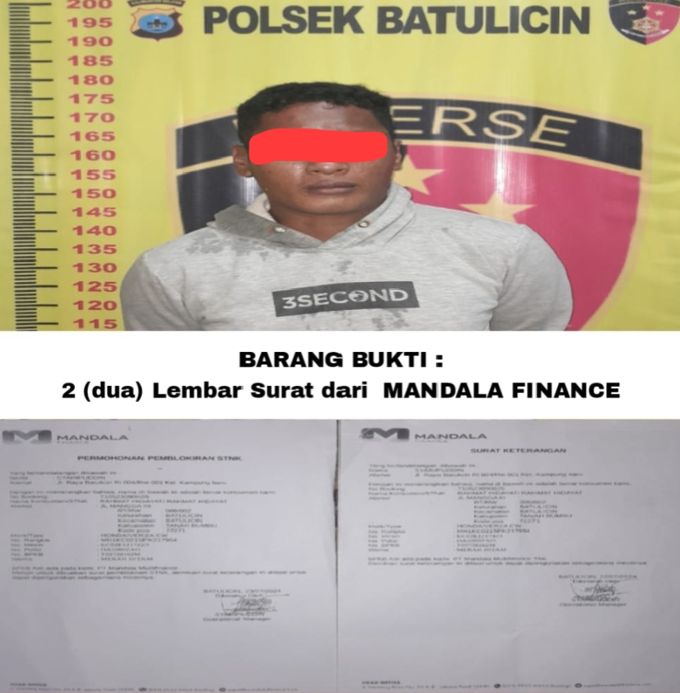 Kata Areif, “Setelah Pihak Kepolisian Polsek Batulicin mendapatkan Laporan dan melakukan penyelidikan, Unit Reskrim Polsek Batulicin telah berhasil mengamankan 1 orang tersangka berinisial NU (26) di Jalan Pesantren, Kel. Kampung Baru, Kec. Simpang Empat, Kab. Tanah Bumbu. Kemudian tersangka di bawa ke Polsek Batulicin untuk proses hukum lebih lanjut. Barang bukti 2 lembar surat keterangan kepemilikan sepeda motor Verza DA 5090 ZAO dari MANDALA FINANCE. Selanjutnya tersangka dan barang bukti dibawa ke Polres Tanah Bumbu, guna proses lebih lanjut, ”tutupnya.(red)