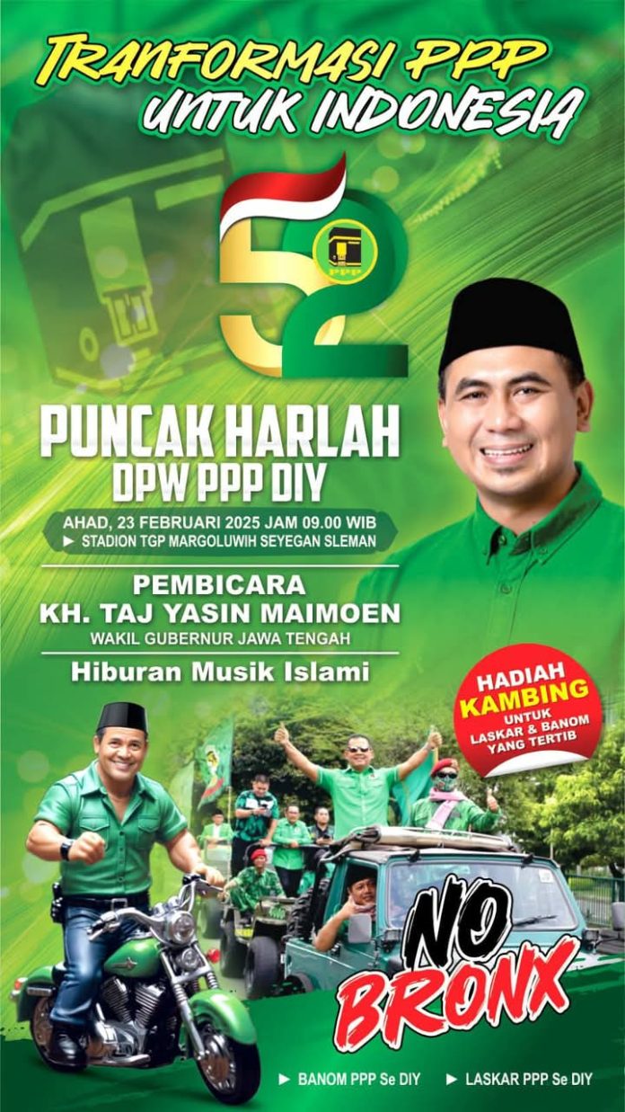 Infosatu.cloud, Yogyakarta – Puncak Harlah PPP Ke-52 DPW PPP DIY , bakal berlangsung meriah. Selain dihadiri pembicara KH. Taj Yasin Maimoen ( Putra AlMagfurloh KH. Maimoen Zubair, Sang Guru & Ulama Panutan, Ulama Khos PPP), yang juga Wakil Gubernur Terpilih Jawa Tengah. Juga undangan Terbuka disampaikan oleh Pimpinan Wilayah PPP DIY yang ditandatangani oleh H Hasan Widagdo (Ketua) dan Mahendra Kusuma Putra (Sekretaris ).