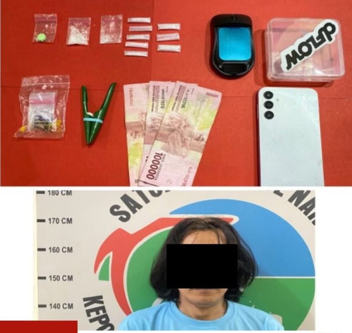 Saat dilakukan penggeledahan petugas menemukan 10 paket narkotika jenis sabu dengan berat 1,8 gram dan 1 butir ekstasi warna hijau pada pelaku.