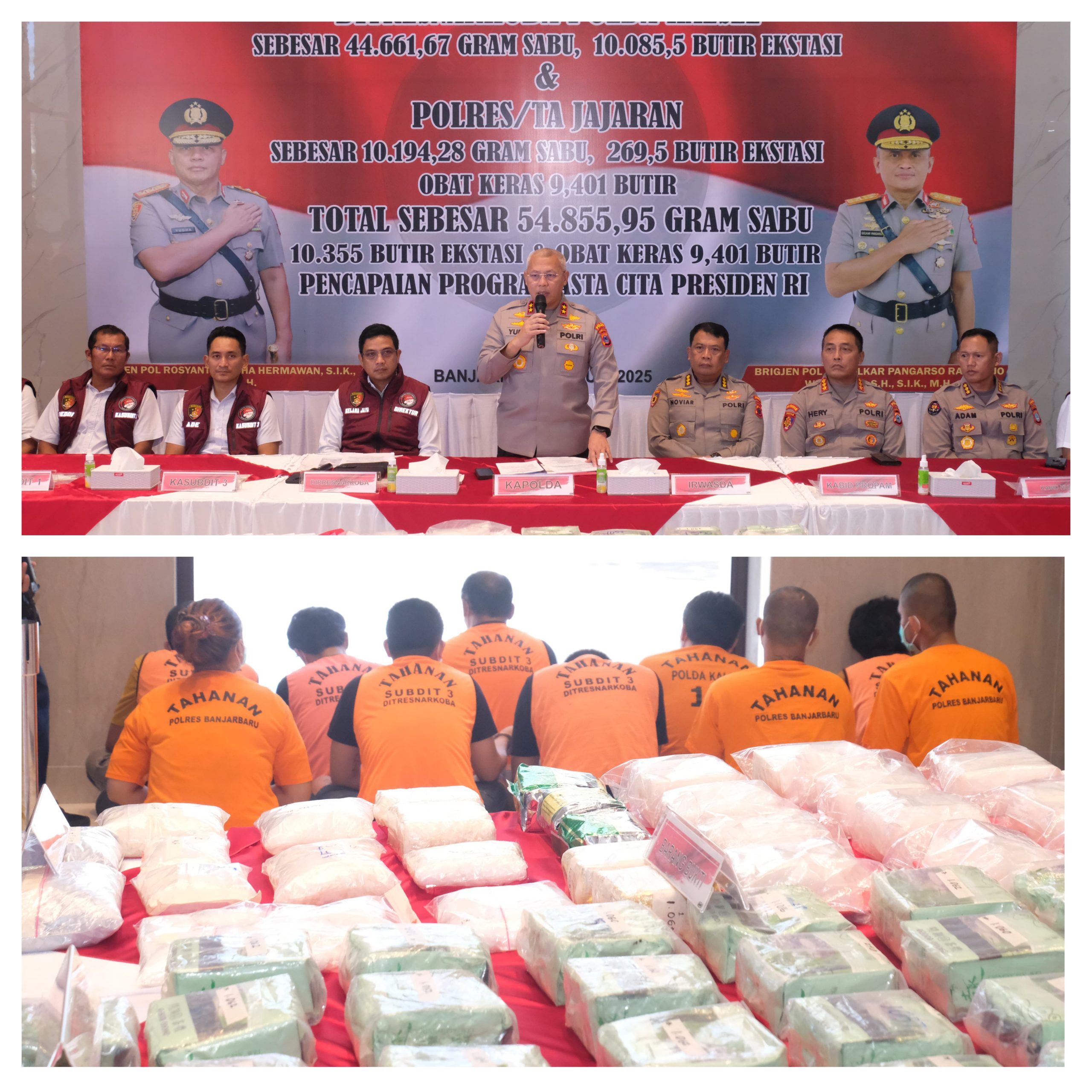 Kabid Humas Polda Kalsel Kombes Pol Adam Erwindi, S.I.K., M.H. mengatakan, dalam konferensi pers tersebut Kapolda Kalsel menyampaikan rincian barang bukti yang berhasil diamankan terdiri dari Ditresnarkoba Polda Kalsel 44.661,67 gram Sabu dan 10.085,5 butir Ekstasi. Kemudian, Polres/ta Jajaran Polda Kalsel mengamankan 10.194,28 gram Sabu, 269,5 butir Ekstasi dan 9.401 butir Obat Keras.