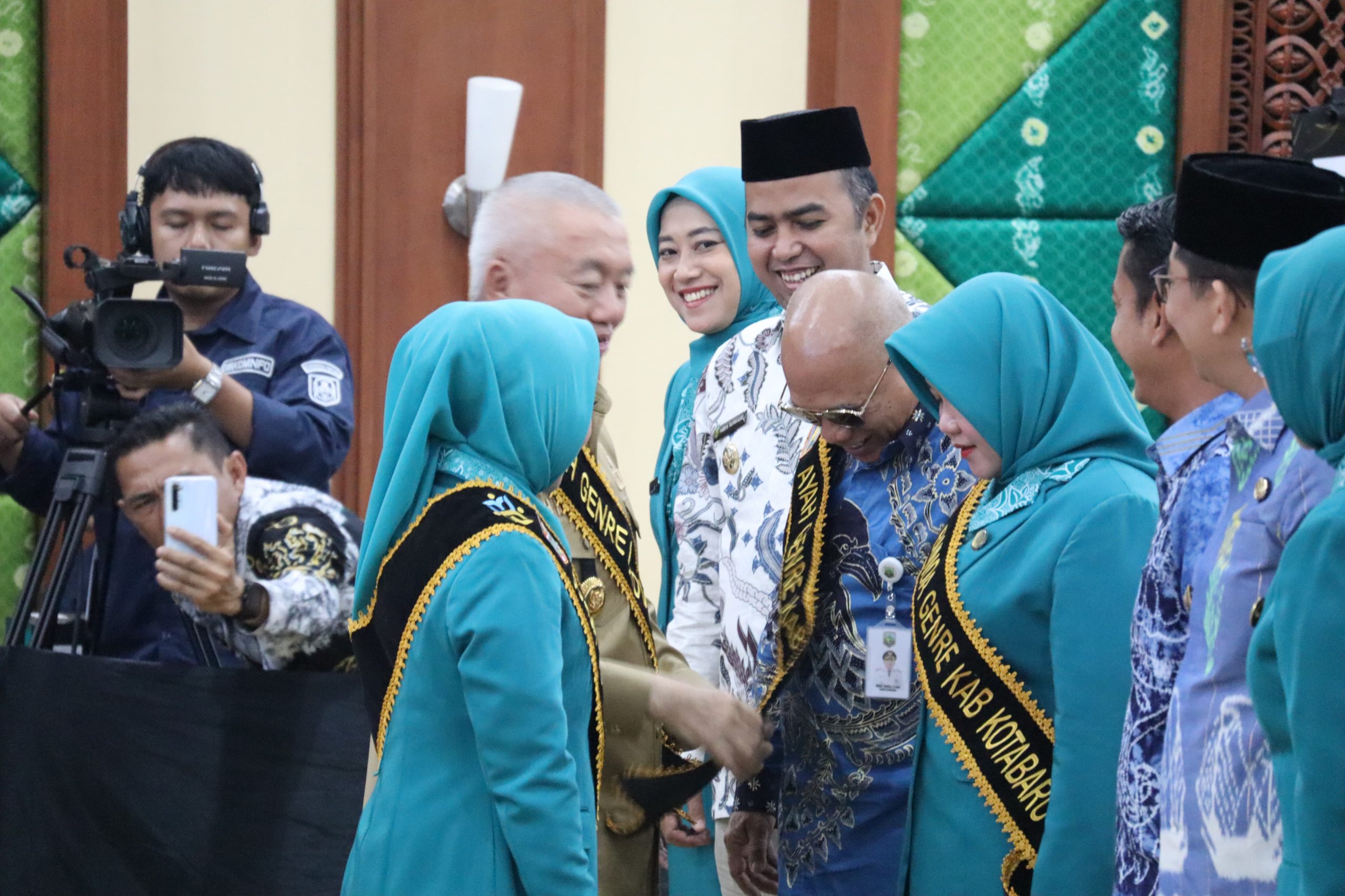 Deputi Bidang Pengendalian Penduduk Bonivasius, mewakili Menteri Kependudukan dan Pembangunan Keluarga Republik Indonesia, memasangkan kain selempang kepada Gubernur Kalsel H. Muhidin beserta istri, Hj. Fathul Jannah, yang dikukuhkan sebagai Ayah dan Bunda Genre Kalimantan Selatan.