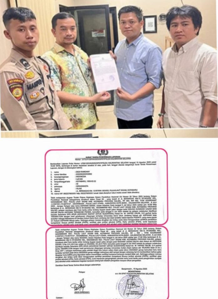 Infosatu.cloud – Dedi Ramdany, S.H. resmi melaporkan Ketua Umum dan Sekretaris Jenderal Perkumpulan Pengacara dan Penasehat Hukum Indonesia (P3HI) ke Unit Kriminal Khusus Polda Kalimantan Selatan, Jumat (15/8/2025). Laporan tersebut terkait dugaan penggunaan ijazah dan gelar palsu, sebagaimana diatur Pasal 69 ayat (1) UU Nomor 20 Tahun 2003 tentang Sistem Pendidikan Nasional.