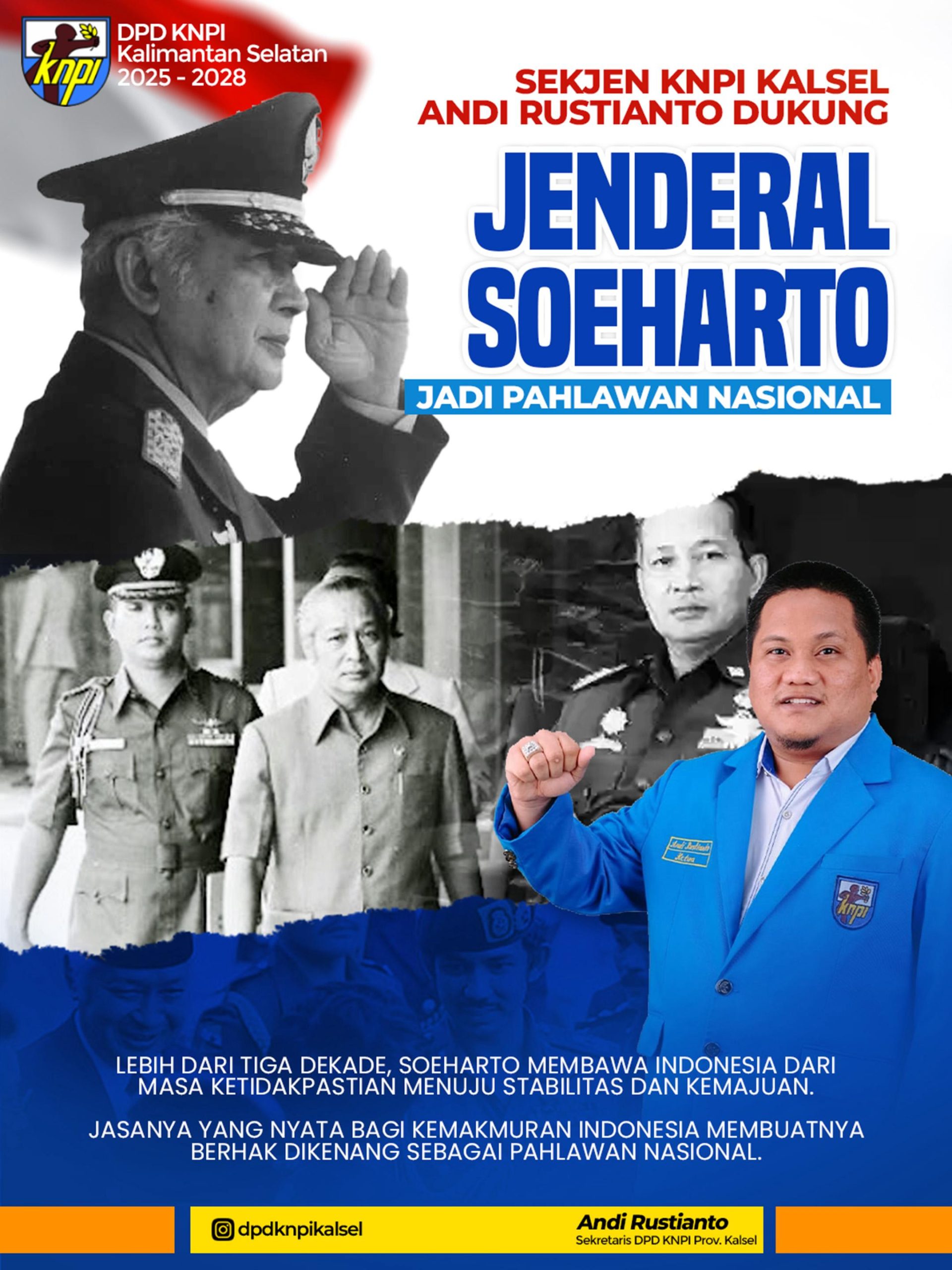 Sekretaris DPD KNPI Kalimantan Selatan, Andi Rustianto, menyatakan dukungan penuh terhadap langkah pemerintah untuk menganugerahkan gelar Pahlawan Nasional kepada Presiden Republik Indonesia ke-2, H. M. Soeharto, dengan alasan jasa-jasa besar yang telah diberikan dalam perjuangan dan pembangunan bangsa, Kamis (6/11/25).