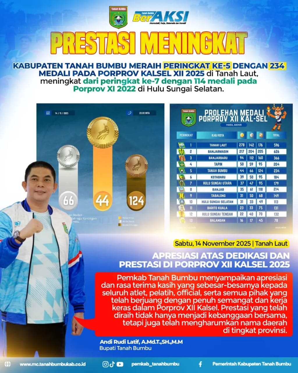 Infosatu.cloud, Tanbu – Bupati Tanah Bumbu Andi Rudi Latif menyampaikan Apresiasi dan Terimakasih para Atlet Tanah Bumbu atas torehan prestasi membanggakan pada Porprov Kalsel XII 2025.