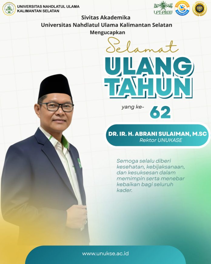 Banjar, Kalsel – Suasana haru dan penuh sukacita menyelimuti perayaan ulang tahun ke 62 Rektor Universitas Nahdlatul Ulama Kalimantan Selatan (UNUKASE), Dr. Ir. H. Abrani Sulaiman, M.Sc. Milad Rektor UNUKASE yang lahir pada 5 Januari 1964 tersebut dirayakan dengan penuh kejutan dari sahabat, kolega, hingga lembaga mitra kerja Universitas.