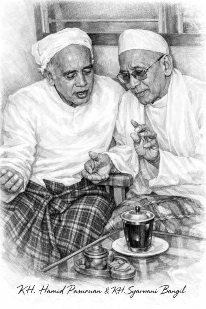 Seketika itu Haji Muhdor segera memberitahukan ke Guru Syarwani bahwa sekarang ada Kyai Hamid di ruang tamu depan, maka langsung lah Guru Syarwani Bangil bergegas menemui Kyai Hamid yang sedang menunggu beliau. Maka terjadilah pertemuan kedua ulama tersebut di rumah Haji Muhdor. Saat itu Kyai Hamid dan Guru Syarwani Bangil mereka saling merangkul dan mencium tangan.