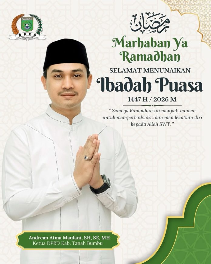 Infosatu.cyou, Tanbu – Ketua DPRD DPRD Tanah Bumbu, Andrean Atma Maulani, menyampaikan ucapan selamat menunaikan ibadah puasa 1447 Hijriah/2026 Masehi kepada seluruh masyarakat di Kabupaten Tanah Bumbu.