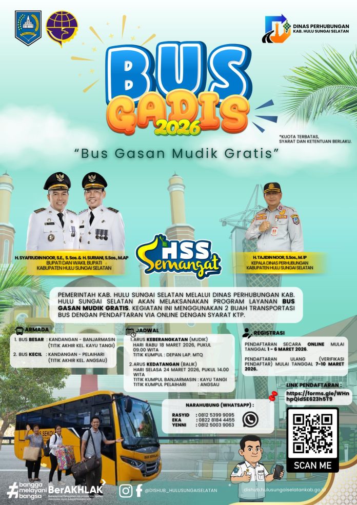 Infosatu.cyou – Pemerintah Kabupaten Hulu Sungai Selatan Provinsi Kalimantan Selatan, melalui Dinas Perhubungan Kabupaten Hulu Sungai Selatan melaksanakan Program Layanan Bus Gasan Mudik Gratis.