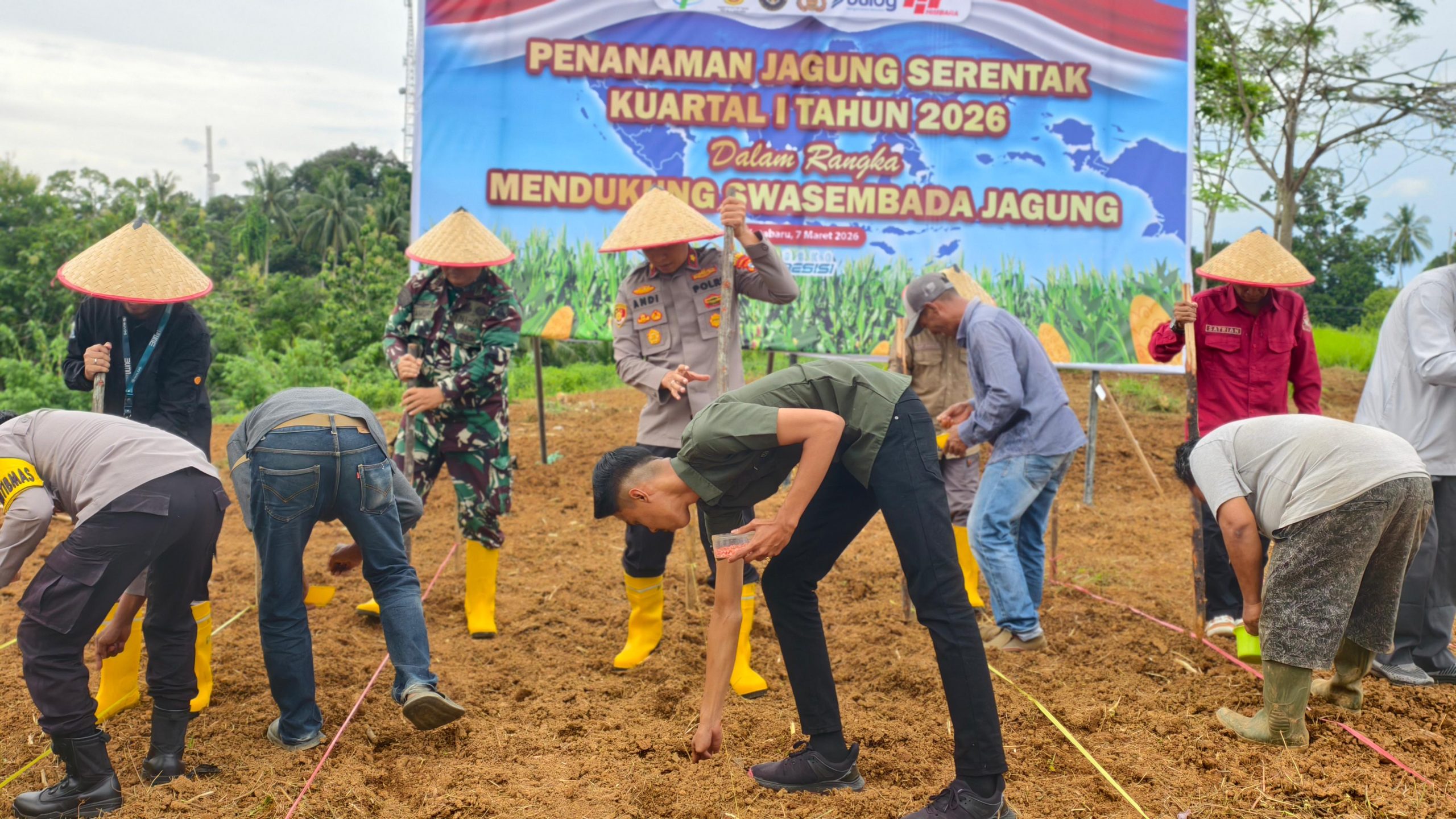 Infosatu.cyou, Kotabaru – Dalam rangka mendukung program swasembada pangan nasional tahun 2026, Polres Kotabaru melaksanakan kegiatan Penanaman Jagung Serentak Kuartal I Tahun 2026 di Jalan Berangas Km 7, Desa Sarang Tiung RT 01, Kecamatan Pulau Laut Sigam, Kabupaten Kotabaru, Sabtu (7/3/2026) sekitar pukul 14.50 WITA.